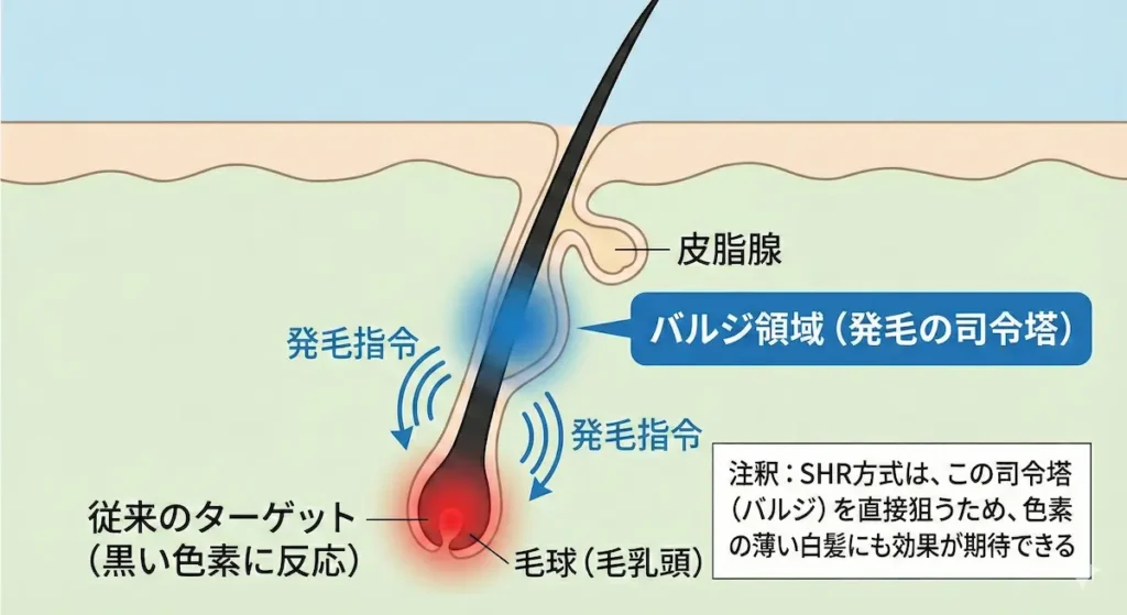 しかし、SHR方式は毛を生やす司令塔(バルジ領域)を直接狙うため、白髪に対しても全くの無力ではないという。