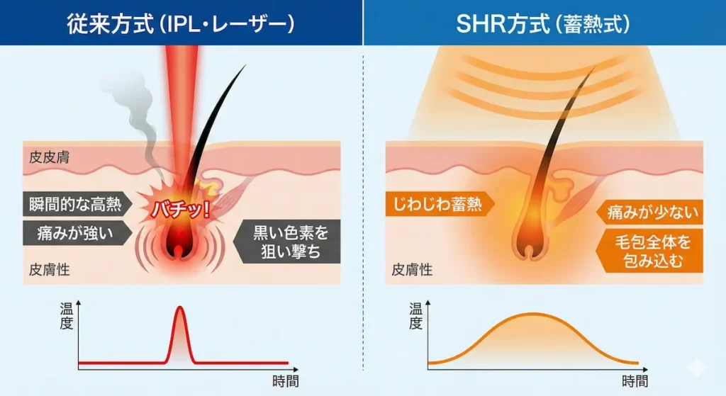 「他社で主流のIPL方式は持続性が低く、数年で毛が再生するが、SHRは持続性が高い」という。 もはや、どの情報が正しいのか分からない。