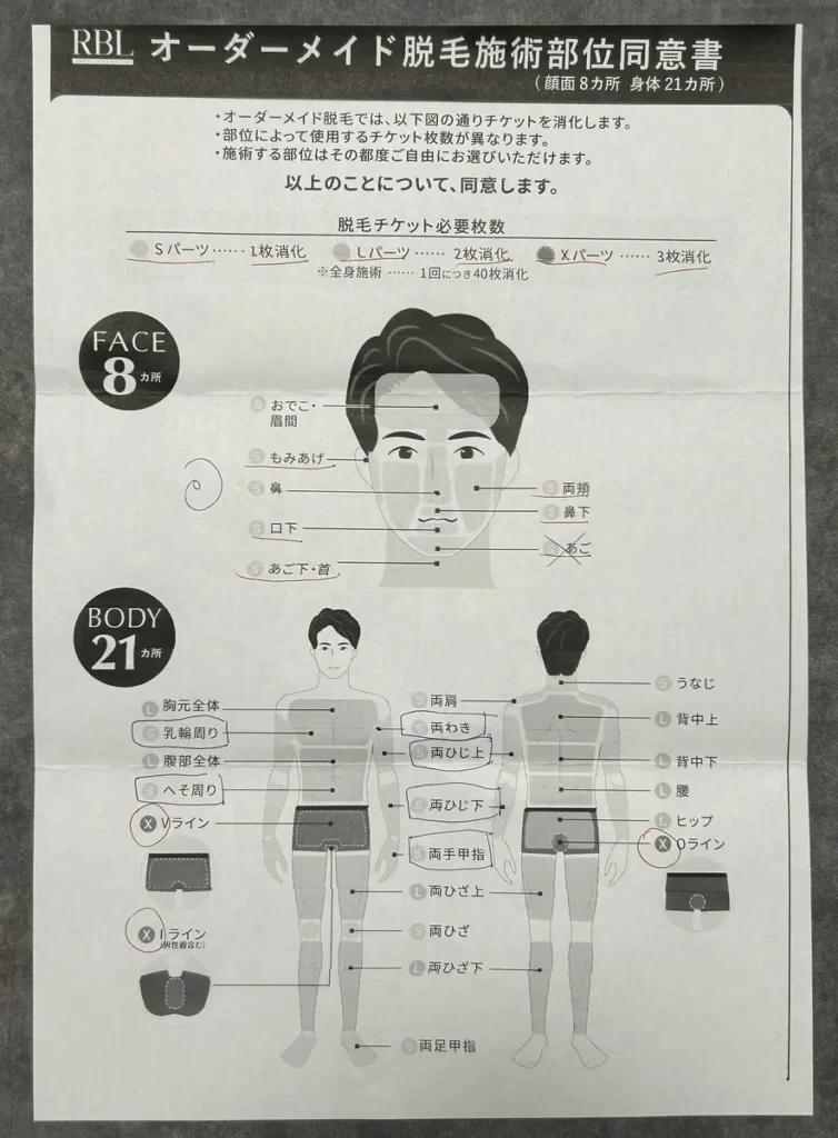 プランにより支給されるチケットの枚数が異なる。施術する部位により、使用するチケットの枚数が異なるとの事。