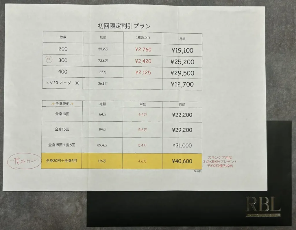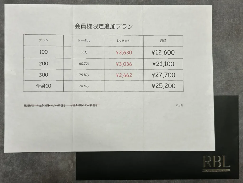 ▲会員向けの追加で施術する際のプラン。RBLではチケット制となっている。