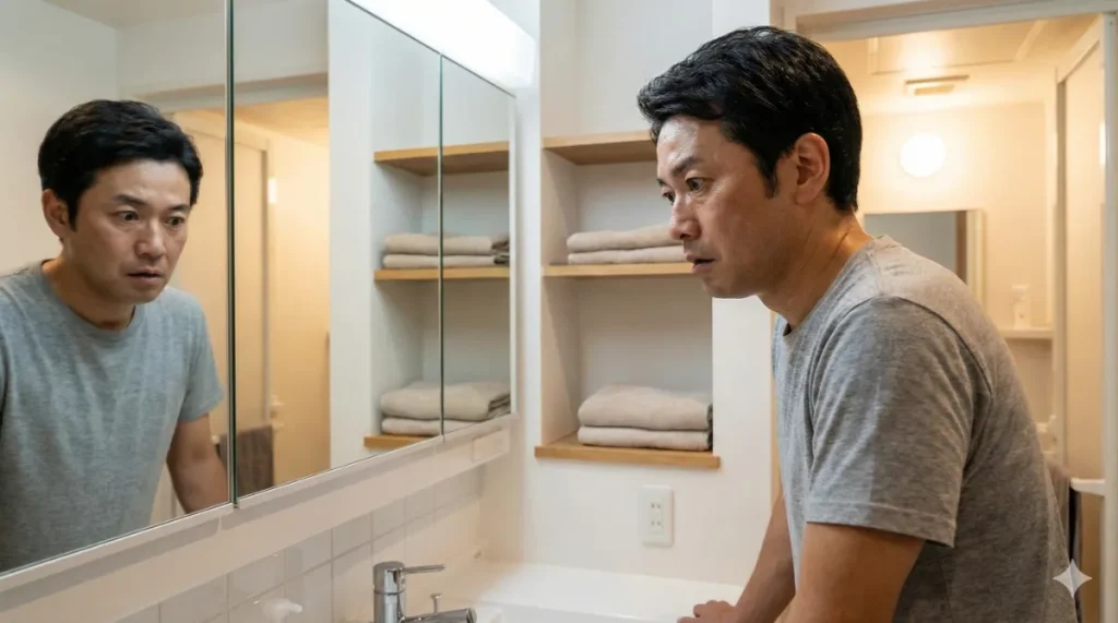 誰に見せる予定もない場所ですが、鏡の前で全裸のまま、しばらく言葉を失って立ち尽くしました 。これは単なる老化ではなく、身体の「仕様変更(劣化)」なのです 。